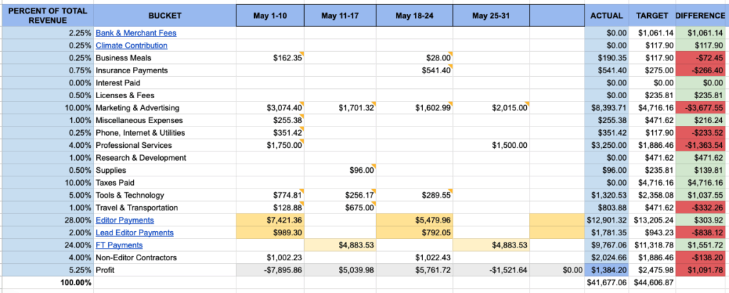 At my last agency, EditorNinja, we tracked them weekly and then I reviewed them monthly. This is how the spreadsheet looked:
